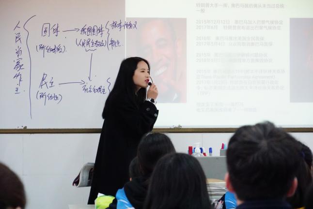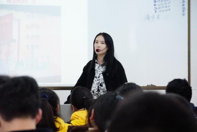 工作室成员林丹老师将同一节课上出了不同的味道,林老师以习总书记的新春致辞切入本课,点出我国的国体是什么,进而以学习共同体的方式,以学案为载体让学生在合作探究中突破本节课最大的难点知识——人民民主的特点,此教法贯彻了生本课堂理念,突出了学生的主体地位。林老师才思敏捷,能并对学生的回答予以了及时、精准且多样的评价,并对学生的思维做了实时反馈,林老师的精彩表现受到了师生的高度赞赏。