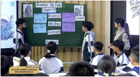 接着瓯教院附中塘下校区的张梦思老师呈现了The Twits Chapter5-8读中推进课。本节课在学生已自主阅读原著并借助教师设计的Reading log梳理故事内容后的基础上展开。张老师以Who are they?What are they like?这两个问题作为导入,邀请学生扮演Mr Twit/ Mrs Twit并做介绍,开场就充满趣味。接着张老师围绕Chapter 5-8中的关键内容the four tricks设计课堂任务,在梳理了the four tricks的细节信息后,让学生小组合作,并以角色扮演的形式讲述Mr Twit/Mrs Twit的行动或反应。在展示环节,学生以小组为单位演绎最喜欢的章节内容。在“读”与“演”的过程中,教师适时点拨,用表演和模音的形式帮助学生理解生难词的意思;学生全情投入,用表演的方式展示对原著的解读,体会整书阅读带来的快乐。