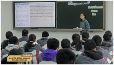下午,瓯海区梧田第一中学的黄倩倩老师执教的《When you are old》诗歌课,带学生第一次走进英文诗歌的世界。黄老师在以沙画视频与温情音乐导入后,让学生先观察出英文诗歌的Stanza(诗节)与line(行),再听出和朗读英文诗歌的rhyme(韵律)与rhythm(节奏),在理解每一节诗的过程中,引导学生感受诗人深沉的爱,最后让学生联想到自己所爱之人,并为之朗读。通过这节课,学生欣赏到了诗歌的形式之美,韵律之美与意境之美。