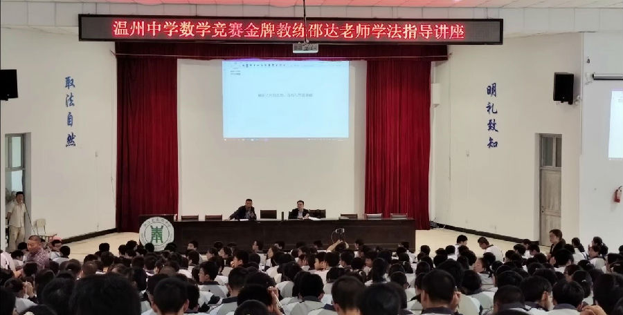 工作室主持人、温州市名师、国际数学竞赛金牌教练邵达老师在泰顺中学科技楼报告厅给工作室全体成员和泰顺中学的全体高三学生带来了学术性讲座《解析几何的技巧与策略》。邵老师从“运算策略的优化”和“解法策略的优化”两个角度来谈解析几何方面的解题策略,邵老师指出运算的准确度不高和答题的规范性不强,是当前所有学生进行数学学习的一个“通病”,因此掌握一些好的运算策略及其优化程序是必要的。同时还就“什么是数学?”“为什么学数学?”“怎样学好高中数学”等方面对全体参训师生进行高中数学学法指导。