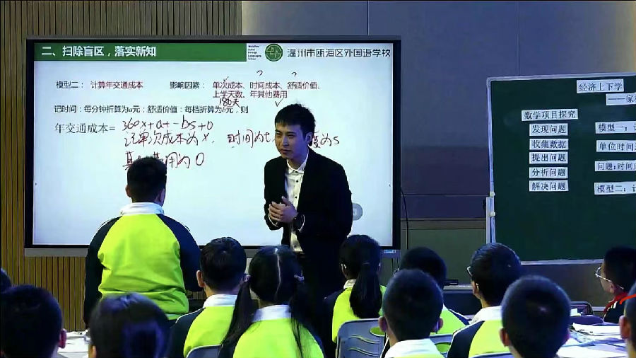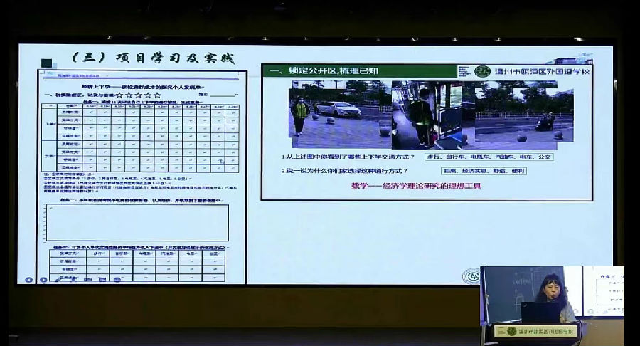 瓯海区外国语学校胡亨老师执教《经济上下学——家校通行性价比的探索》课例,胡老师从“发现生活问题-学生手机数据-提出问题-分析问题-解决问题”几个步骤出发,和孩子们一起分析问题、探索获得了家校通行成本的计算模型,最后利用数学模型解决实际问题。