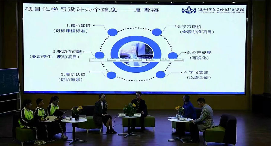 温州市瓯海区外国语学校陈利静老师经验分享《依托发现课课堂,践行项目化学习》,结合胡亨老师和周泽施老师的两节课堂从核心知识、驱动性问题、高阶认知、学习实践、公开成果、全程评价六个维度进行了高端的点评,让我们对这两节课有更深刻的理解,让我们体会到项目化学习是系统的,是核心知识在情境中再构建的过程。