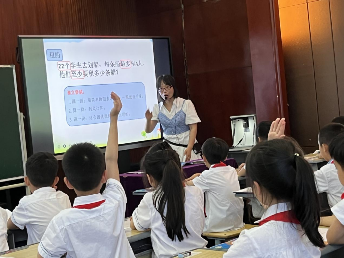第一节由平阳县名师陈巧云执教的《租船问题》,关注的重点是“商”的定位。如何引导学生正确理解并掌握“商”的大小,陈老师精心安排了三个环节:一是图式结合,具体了解商与余数的含义,追问:“5表示什么意思?你能从图上找到5条船在哪里吗?余数2表示什么意思?图中哪里?剩下2人,该怎么安排呢?二是联想类推,“如果23人去划船呢?至少要租多少条船才够呢?同样租6条船,你还想到多少人?让孩子们举一反三,在量的基础上明确解决此类有余数的问题,关键要看余下的人怎么安排。三是对比明“质”,对比“有27箱菠萝,王叔叔每次最多能运8箱。至少要运多少次才能运完这些菠萝?”和“小丽有27元钱,买8元一个的面包,最多能买几个?”明确“最大数8”与“确定数8”的不同,理解看似相同数据背后的不同含义,理解“进一法”与“去尾法”的不同。