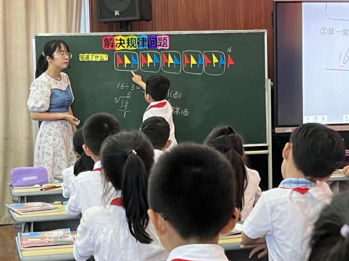 第二节由平阳县县教坛新秀周冰倩执教的《解决规律问题》,关注的重点是“余数”的定位。 周老师由“猜一猜、猜颜色”导入,通过“画图法、例举法、除法计算”等方式引导学生图示结合理解“余数”的含义,在理解算法多样化的基础上进行方法上的优化。提问“如果就这样摆下去,第20面小旗是什么颜色?第27面小旗是什么颜色?”引导学生举一反三,学以致用。挑战性提问“”47÷3我们还不会算,如果可以告诉你商或余数中的一个,你想知道谁?为什么?余数是2,那第47面小旗是什么颜色?”更是让学生跳出现象看本质,真正体验“余数”的妙用。