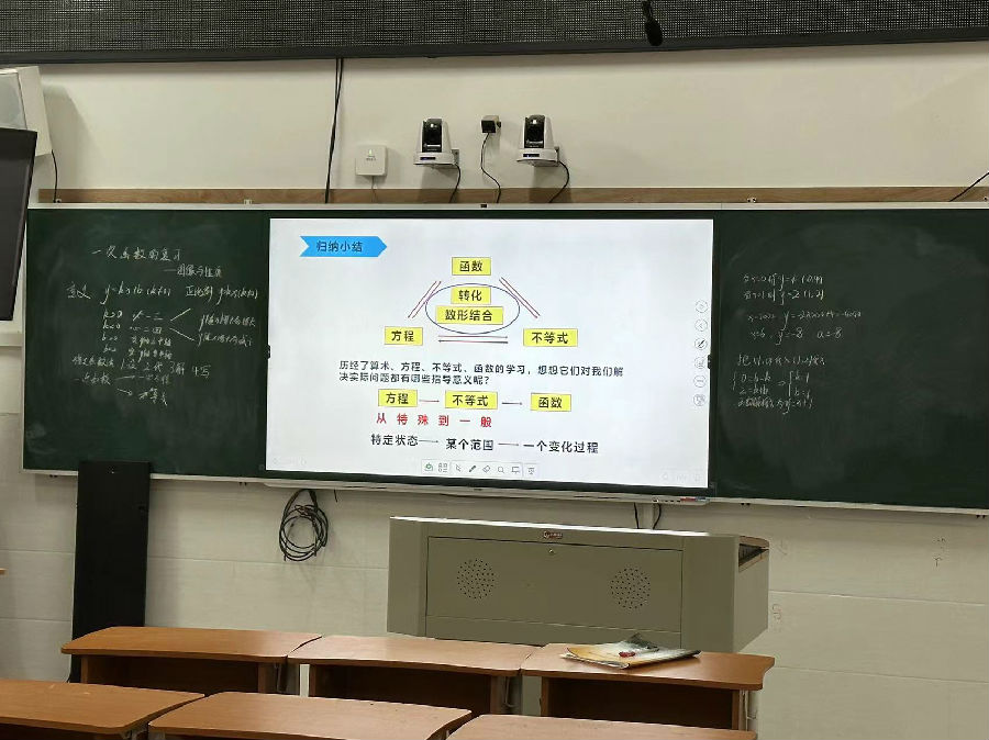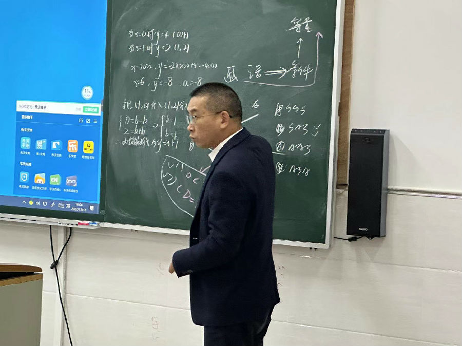 第二节课是由溪下学校潘春森老师带来的《一次函数的复习》,潘老师给出一次函数的解析式,以开放性问题对课堂进行展开,然后以数导形,以形补数的形式对一次函数的图像进行性质方面的引导和解析,课堂问题循序渐进,难度层层递进,浅入深出地讲解了一次函数的相关知识,最后在一道应用中结束了本节课。