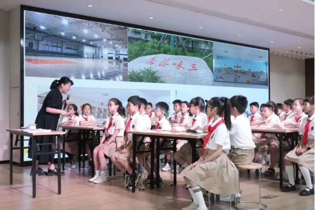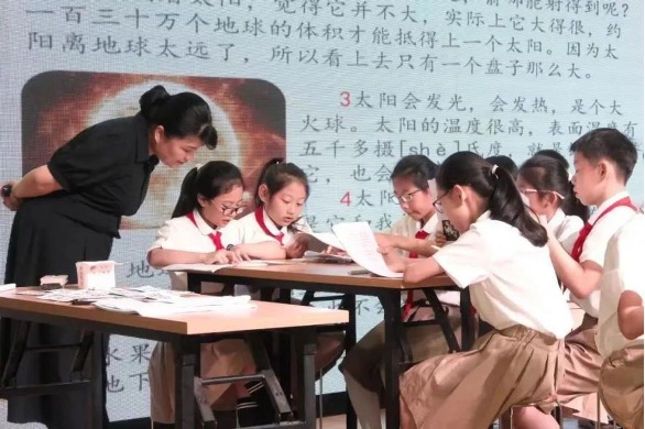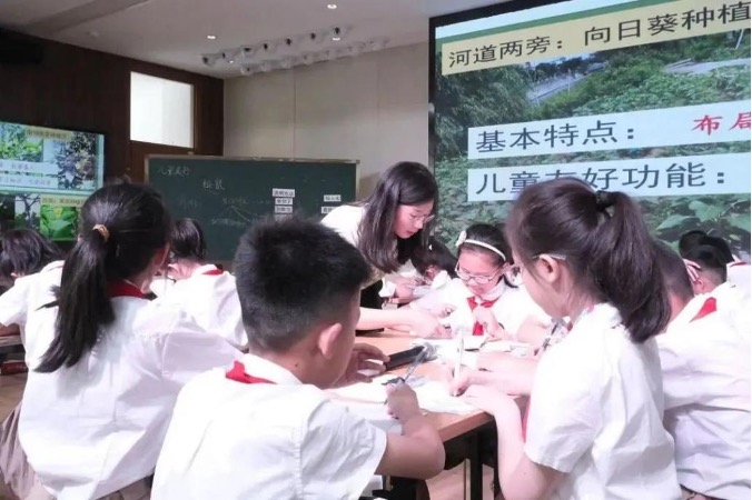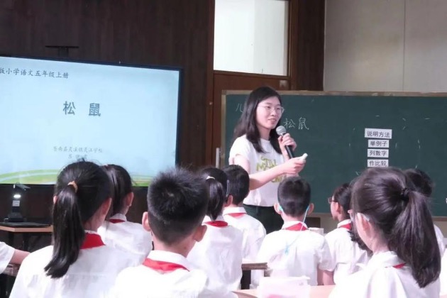 第一节课,瑞安市实验小学蒋丽蓉老师带领四年级2班学生学习《太阳》。蒋老师创设学校要参加“儿童友好学校评比”为主题情境,以如何正确提交简介材料和进行现场解说为主题任务,开启单元教学。梳理课文之后,结合课文内容让学生进一步感受列数字等说明方法的用处。再让学生尝试用恰当的说明方法,对一处儿童友好设施——“达人桥”进行练笔介绍。