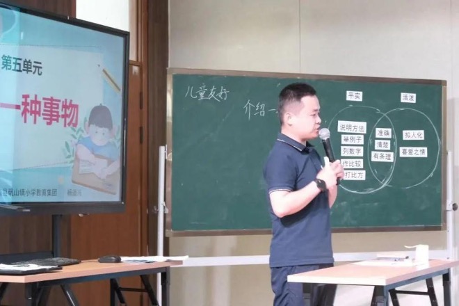 第三节课,苍南县矾山小学杨道兴老师执教《习作:介绍一种事物》。杨老师以“校园招募令”导入,让学生介绍学校儿童友好设施,提出习作要求。课堂上,学生在学习和对比两篇习作例文《鲸》和《风向袋的制作》中,进一步巩固不同说明文语言风格的特点,总结写说明文的方法。而后,以“乐高区”为例示范方法,让学生发散思维,小组讨论中完成不同设施介绍内容的思维导图。在此基础上,让学生借助资料,自行选择语言风格,尝试完成习作。布置课后作业,引导学生自主选择任务,完成说明文的习作巩固。