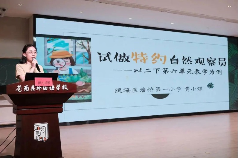 瓯海区潘桥一小黄小嫘老师分享《试做特约自然观察员——以二下第六单元教学为例》,介绍了如何创设三大任务、提供具身体验支架,从而使隐性的思维得以显形,不断促发思维生长力,最终达到优化知识结构、提升认知能力,从而系统实现语文“实用”的目标。