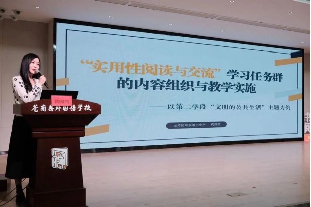 龙湾区瑶溪六小周微微老师分享《“实用性阅读与交流”任务群的内容组织——以第二学段“文明的公共生活”主题为例》,提出单元整体设计的三个建议:整合学习资源,组织课程内容;还原真实生活,推进能力进阶;贯穿生活情境,沉浸真实表达。