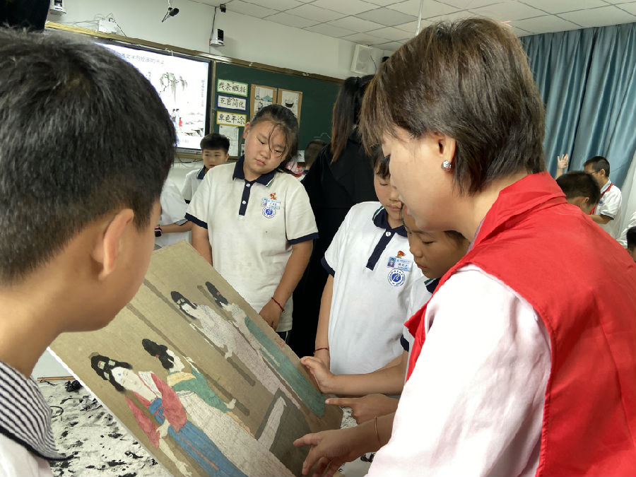 在新授环节,分成三大组的学生缓缓打开原作高仿作品,精致的装裱和栩栩如生的人物,让人目不暇接,惊叹连连。学生在欣赏的过程中,直观了解“长卷”这一绘画形式,以及观看方式。接着黄老师让学生拿出课前导学单,学生一边看一边说明画面里蕴含的信息,并让学生伸出手,体会画面里的人物构成了怎样的线条?巧妙地让学生理解画面中的“节奏感”。随后黄老师步步深入,又让学生从人物的组织排列上欣赏,理解画面的“疏密对比”。在后面的环节中,以一个“煽火”的小女孩为引线,顺理成章地让学生理解画家巧妙的“构图”、雅致的色彩、灵动的线条。最后,黄老师又展示了唐代的生活画卷,学生看得兴致盎然、意犹未尽。