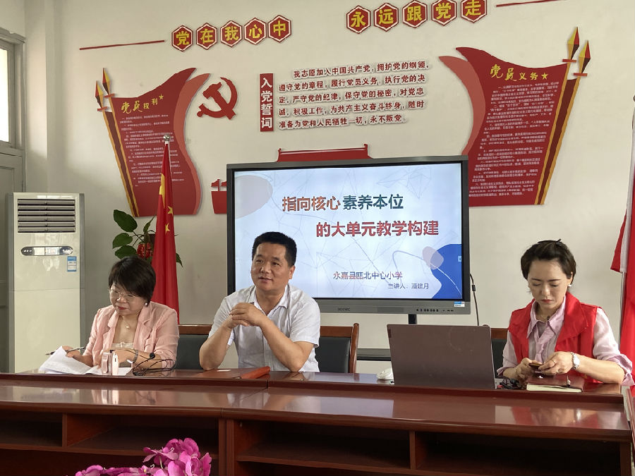 下午工作室几位学员代表结合他们各自的教学实践成果分别进行了新课标的解读的实践的分享,永嘉县名师潘建月老师为大家分享了《大单元的建构》,她以自己的实际案例为引,详细地解释了何为核心素养、何为大单元、如何建构大单元等问题,明晰了概念和具体操练之后就有了“照样画葫芦”的模板。让此次学习活动划上圆满的句号。