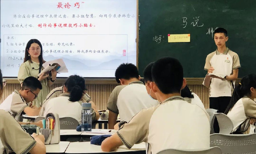陈雅婷老师的教学以青春up演说家pk赛为情境,引导学生探究《马说》的论事说理技巧。第一环节“最说‘形’”中,陈老师以“文章中的马与心目中的马”为对比,引导学生审视韩愈笔下千里马“不平则鸣”的特点。第二环节“最论‘巧’”中,学生们通过小组合作的方式总结并制作韩愈小论说里的说理技巧小贴士。最后“最用‘策’”环节中,陈老师出示《龙说》一文,鼓励学生将总结的说理技巧运用到课外文言文的阅读中,培养学生学习的迁移能力。