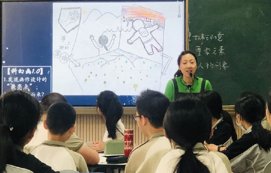 陈伊丽老师以为学校钱学森纪念馆征集科幻画为情境,要求学生结合《带上她的眼睛》一文,设计课文的科幻画学生在这一过程中。在上台展示、解说过程中,学生认识到故事环境、重要元素、人物形象和叙事结构等要素,并发现需要再从文本细节中更加完善科幻画。陈老师因势利导,给出小助手,推动学生在小组中升级一幅科幻画,并上台展示,最终投票选出最受大家喜爱的科幻画。陈老师的这堂课将语文与科幻画相结合,展现了一堂有创意的跨学科语文课。