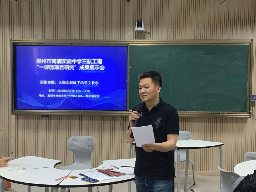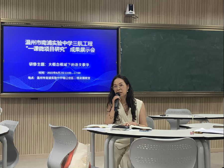 6月2日下午,“大概念视域下的语文教学”专场活动在温州市南浦实验中学锦江校区二楼录播教室开启。活动分为课堂展示、说课、研究过程分享、教师评课、现场打分与颁奖、专家专题报告等环节,两位教师的语文课堂精彩纷呈,展现出对大概念教学的理解,教师们在认真观摩、积极探讨与分享中得到提升与成长。