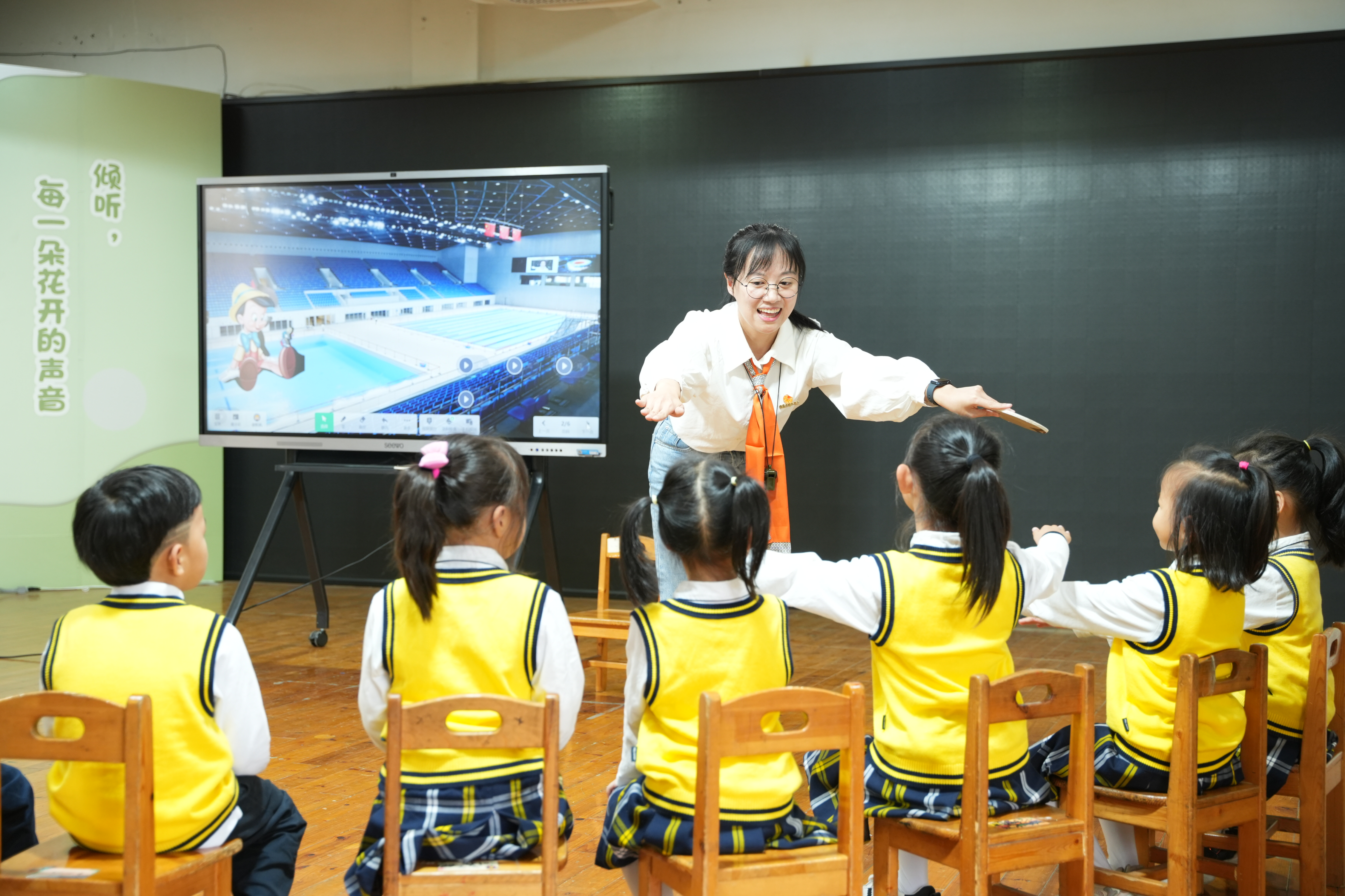 谢老师以诙谐幽默的肢体语言和动作示范,与孩子们一起沉浸在小木偶的无声梦境中,以无声课堂的方式,和孩子们进行各种动作练习,聚焦师幼互动中的动作、表情、情绪互动。再观看有声韵律活动《木偶运动会》,教师对两节活动进行记录、对比和反思……