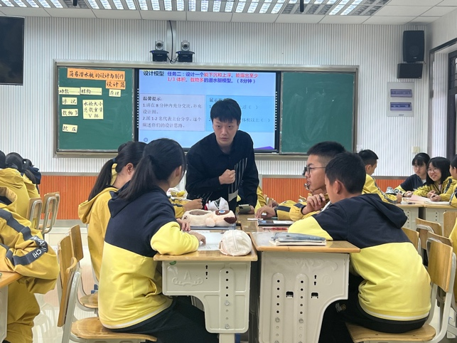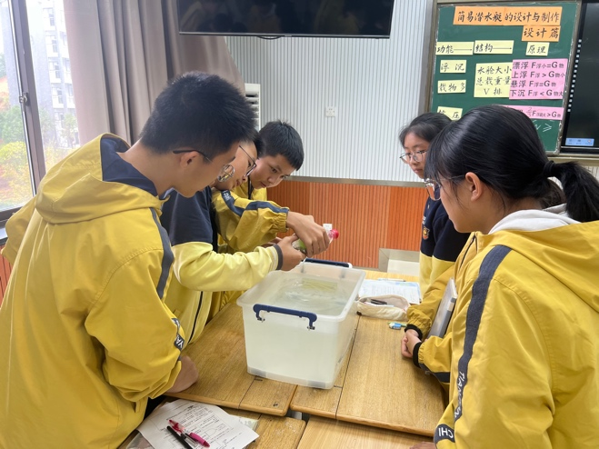 第二节课由来自南浦实验中学的叶建荣老师带来《设计制作简易的潜水艇》,引导学生成为小小工程师,设计潜水艇。学生先进行头脑风暴,说出自制潜水艇的功能并反推其结构。学生小组六人积极讨论,带着叶老师的要求设计了一个能下沉和上浮且载物多的潜水艇模型,学生集思广益,创意满满,设计新颖且有自己的特色。最后小组成员通过计算,选择一个潜水艇模型动手实现沉浮。学生们沉浸式体验了潜水艇沉浮的过程,并对现实中真实潜水艇的设计做出评价以及思考。