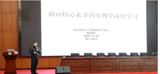南京师范大学教授解凯彬教授,给大家带来《指向核心素养的生物学深度学习》讲座,他以人工智能进展为例解释了深入学习概念的变迁,并指出当下学习停留于浅层的几点现象:“碎片化的学习”“过度依赖PPT等信息技术”等,通过具体的生物学问题,例如“发烧时人胃口不好的本质原因”,提出了深度学习的五大特征,指出了教师教学中创设真实、有吸引力的情境的必要性。