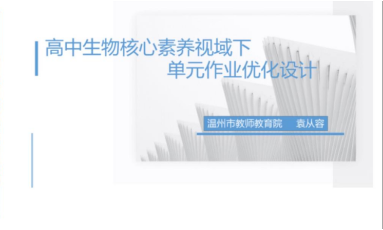 本工作室负责人、温州市教师教育院袁从容老师分享了高中生物核心素养视域下单元作业优化设计。她从调查作业问题所在实际情况出发,提取“好作业”密码即课标、教材课后练习、高考真题等。有效作业必须是“关注学习过程,促进学生思维”。最后还分享了具体的单元设计练习,并且制定了“单元作业反思评价表”。