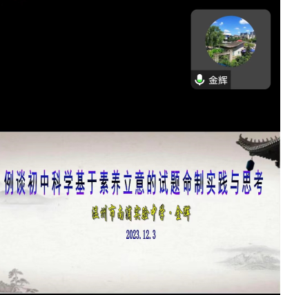 2023年12月3日晚上,温州市郑建铭"名师送教"工作室第7次活动暨命题培训活动在腾讯会议线上举行,本次活动邀请"温州市名师”、“浙派名师培养对象”“中考命题专家”温州市南浦实验中学金辉老师作题为《素养立意试题命制的实践和思考》的专题报告。