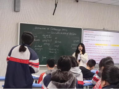 龙湾中学的何苗苗老师指出,黄小维老师的这节课是一节非常好的示范课。首先,她抓住了关键问题:导入视频中凸显了矛盾点,正所谓“无故事不冲突”;黄老师引导学生关注段首句中的关键词以及衔接句是否与首句的关键词呼应等。其中,老师的提问“哪些词可以用在我们的写作中”是一大亮点。针对这点,何老师提出了建议:这里是不是可以继续追问学生“为什么要找这些关键词”继而引出诸如“悦纳自己姐姐身份”的主题来?另外,黄老师心思巧妙,课堂板书设计成一朵花,包含了本篇续写的关键词和脉络,非常用心。最后,何老师还提出了一个思考:文章的主题是否可以再细化为:“二胎姐姐的心灵成长”?