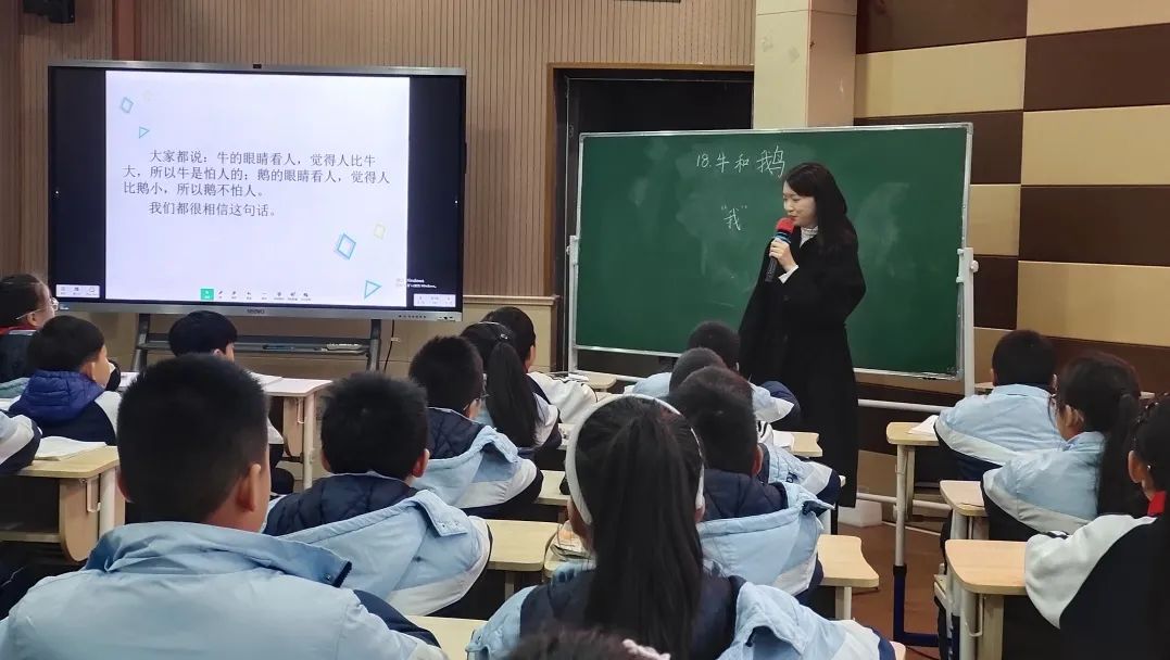 刘老师执教的《牛和鹅》主要以“批注式阅读”为中心,从“方法-格式-角度”等方面具体展开。在对“牛的态度”这一块,刘老师从圈划动词、记录关键词,写体会,提供格式等让孩子在这一板块将“批注”落实到位。在后面的“对鹅的态度”这一板块,刘老师将孩子分成“动作组”和“挑战组”,放手让孩子自己找角度这批注,让“批注式阅读”在课堂落实到位。