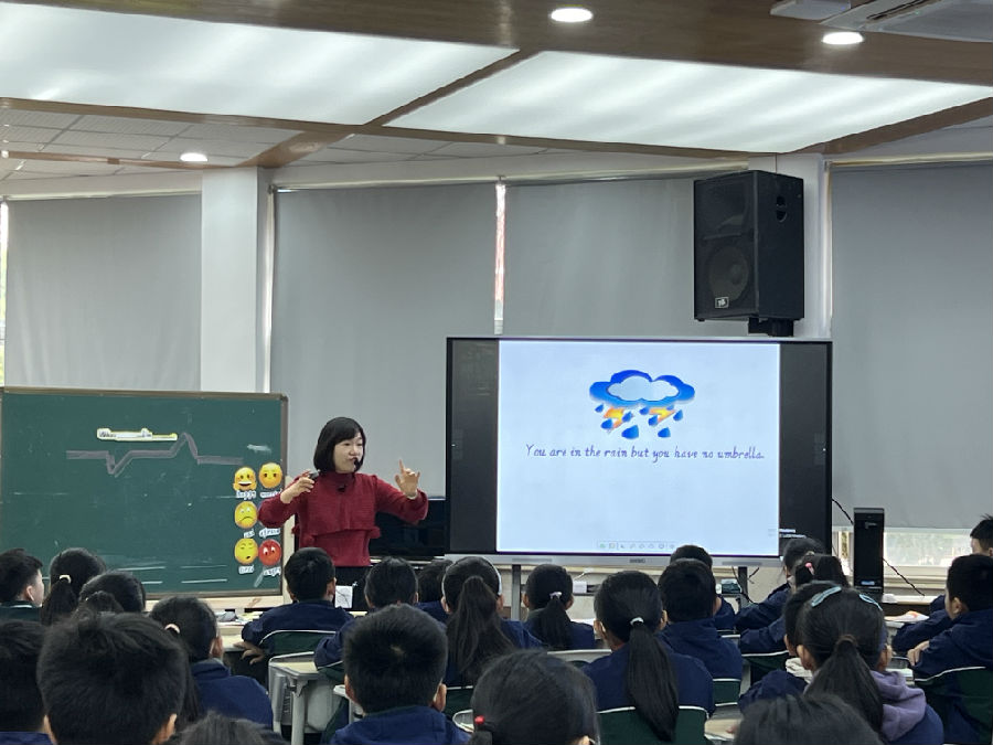 上午第一节课,由龙港市第九小学陈美娜老师执教读写课PEP7 Unit6 B Read and write。陈老师利用Feelings歌曲导入,滚动复习本单元已学内容。以教材中Robin面对不同的事情,产生不同的情绪而导入本课故事的学习,让学生看故事封面用关键词对故事内容进行提问,调动学生思维,促进真实学习的发生。学生在看封面预测故事内容、听音标段落以及为每部分选择Main idea的活动中实现对故事内容的初步感知。学生在细读第一段回答ant的情绪变化以及原因,细读第二段回答Robin的情绪变化及原因中,在陈老师的帮助下运用阅读策略梳理整个故事内容。学生在想一想、演一演等活动中实现对阅读内容语言的补白,更加深刻地体会和体验Ant和Robin的不同情绪。最后在给故事的图片进行排序、复述故事内容的活动中实现对故事内容的再次梳理,体会并得出故事带给我们的寓意。