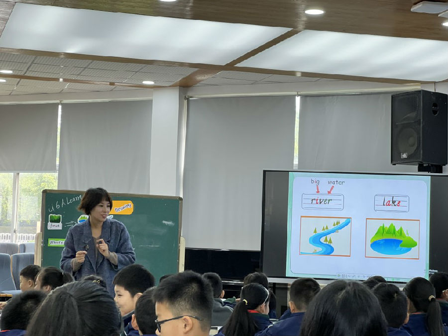 第二节课是来自瓦市小学丁志丹老师带来PEP5 Unit6 A Let's Learn。丁老师创设了参观Nature Park情境,以看图勾选出Nature Park有写什么滚动复习旧知,通过猜主人公的参观路径,借助看一看、说一说、听一听、选一选等不同的方式呈现本课新词,并渗透拼读意识。丁老师利用简单的手势,带学生一起做一做来体会river和lake,hill和mountain的区别。随后,丁老师利用游戏、合作描述、画一画、猜一猜、写一写等活动,示范到位,让学生实现对新词的巩固和运用。