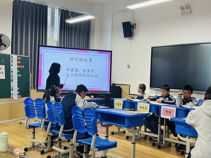 活动第一环节,乐清特校的周洁静老师带来了生活语文课《好吃的水果》。周老师立足生活经验,从认读学生熟悉的水果入手,强调了朗读的清晰度。读词语“苹果”时,她利用半开合的纸片,将图片“苹果”藏在其中,学生通过发音“P”的气流将纸片吹起,成功看到“苹果”,进而加强学生气息的运用和发音的准确度。在朗读句子时,周老师先引导学生进行口肌操,再朗读句子。每个环节环环相扣,充分体现了“医教结合,综合康复”的设计理念,也给予培智学生更多学习的可能。