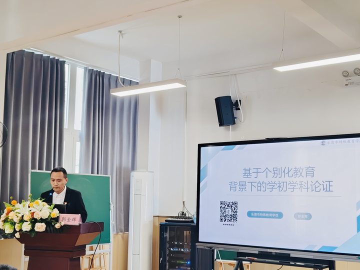 活动二环节,乐清特校的郭金辉老师给大家分享了《基于个别化教育背景下的学初学科论证》,他首先讲述了学校近年来致力于探索个别化教育的历程,接着介绍了各教研组如何最大限度利用在地资源,合理调整相关需求,采取有效的策略,给予特殊孩子最大的支持和个性化学习。
