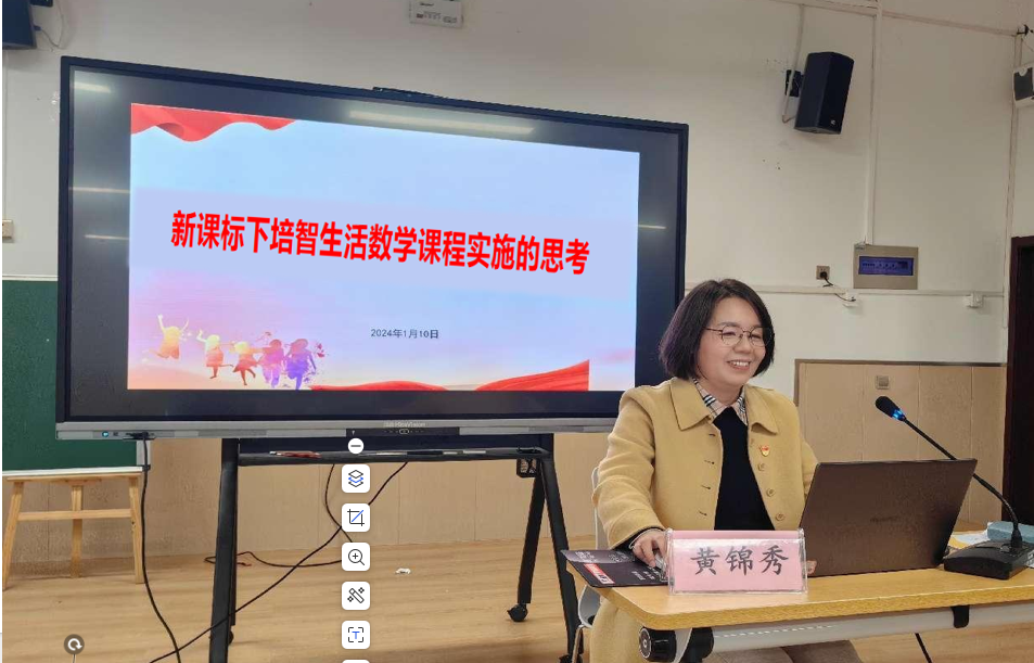 活动第三环节,工作室导师黄锦秀以《新课标下培智生活数学课程实施的思考》为主题展开专题分享。黄老师从特教生活数学课标和普教数学课标的关系为切入点,围绕培智生活数学课标实施的现状、普校数学课程标准的主要变化、普校数学新课标对特教的启示三方面,指出课标、教材、教学之间的紧密关系,建议老师们要依据课程标准,加强学科目标体系研究;聚焦核心素养,加强单元整体教学研究;打破学科壁垒,加强跨学科整合教学研究;坚持任务导向,加强教学评一致性研究。她希望老师们要读懂课标,把握方向;读懂教材,把握特色;读懂学生,把握起点;读懂课堂,提高效率。