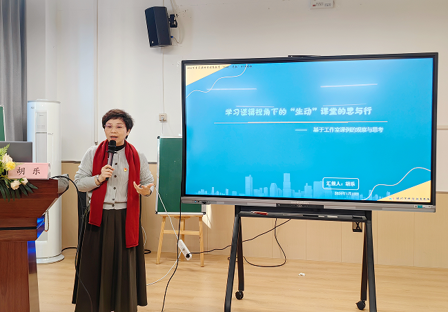 紧接着,温州市特殊教育兼职教研员胡乐以 《学习逻辑视角下“生·动”课堂的思与行》作专题分享。胡老师从学习逻辑的属性和深度学习的概念入手,提出了“生· 动”课堂的理论观点。从认识学生、理论支持和应对策略出发,提出在课堂中应搭建多种支架,助力培智学生的学习,引导他们自主探索和感知课堂。她指出“学、教、评”贯通的重要性,并强调只有巧用重复和进阶,学生才能积累足够的量进而达到质变。