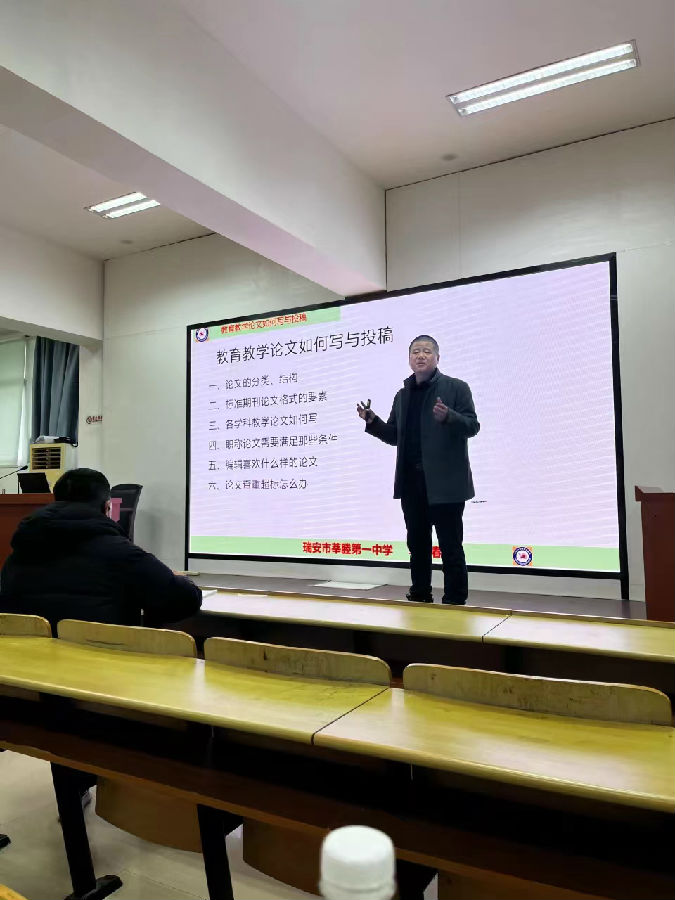 在稍后的讲座活动中,名师工作室的老师们共同倾听了由瑞安市莘塍第一中学的正高级教师李茂春老师对于“教学论文的撰写与投稿”这一话题的经验分享。李老师从论文的分类、格式要素、写作方向等关键点出发,向在座的各位老师全面地分享了论文写作的相关心得,并在论文选题与论文写作指导上给各位老师传授了宝贵经验。