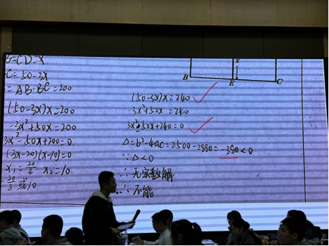 第一项议程由温州实验中学的吴应鹏老师带来的公开课《一元二次方程复习课》,《一元二次方程》为八下第二章内容,上课学生为九年级B班学生。吴老师根据学生的学情,设计了一节低起点、有针对性、有策略的复习课,循序渐进地带领学生回忆知识,从一元二次方程的定义、解法、应用三个角度进行复习。这节课先让学生回顾之前系列方程复习课的模式,回顾梳理知识的方法。紧接着让学生写出符合定义的方程,复习定义,紧接着让学生自主尝试解方程,在学生反馈不同的解法过程中,着重详细复习了一元二次方程的四种解法。在学生熟练掌握二元一次方程的解法后,再让学生解决生活中的应用以及变式练习。纵观整节课,吴老师循循善诱,始终非常耐心细心地等待学生,让学生慢慢回顾,慢慢解决,逐渐引导学生唤醒记忆,让学生在知识的唤醒过程和老师的不断点拨中,不断有自己新的感悟,并且大胆展示自己的解法,说出自己的感悟收获。叶茂恒老师评价:这节课做到了关注真实学情,因材施教,落实了四基四能,还让学生有了更高的领悟。并提醒学员们要思考:常态课,常规课该如何上好?这点非常重要,课的设计要根据学生的真实学情,在复习课中要花大力气唤醒学生的记忆,唤醒后要让学生熟练知识结构,找到知识的内在联系。