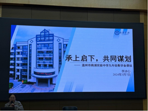 接着,由温州市南浦实验中学九年级备课组组长李冰心老师作《承上启下,共同谋划》专题讲座。李老师先简单介绍了南浦实验中学九年级的师资配备等基本情况,接着详细介绍了九年级备课组的一些常规工作:试题研讨、习题专题编写、试题筛选、主题开课、考试诊断与分析等,常规工作细而杂,从李老师展示的备课组各项详细安排表和组员讨论照片和视频中,感受到备课组员的认真细致和团结热枕,众志成城的决心。而后,李老师还解读了备课组三轮中考复习计划的时间、复习内容、组员分工等安排,目的是希望学生通过一轮复习夯实基础,形成知识体系;二轮专题复习,着重掌握核心知识与核心技能,提升数学素养;三轮复习命制基础过关卷、微卷、综合模拟练习,帮助学生调整考试状态。