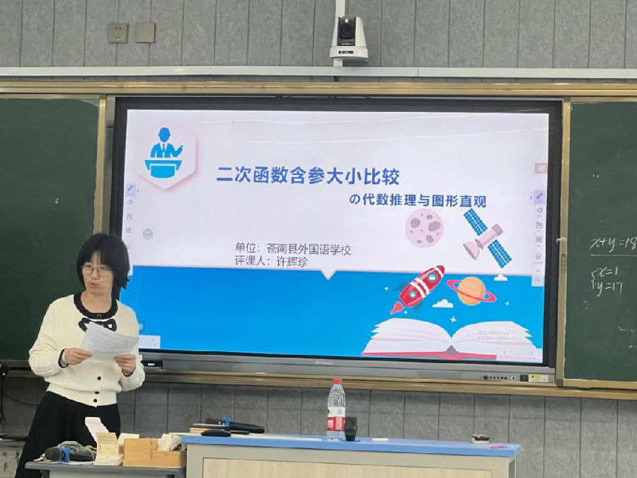 首先是苍南县外国语学校的许辉珍老师就《二次函数含参大小比较》这节课展开评课,许老师表示这节课的设计有两个亮点,一是问题设计层层递进,由浅入深,环环相扣,学生在接受度和参与度方面反映都非常好,不同层次的学生都能参与到本节课中来;二是前面的问题设计能为后面的问题解决提供方向,使得学生能够实现知识和经验的迁移。她也从自己的视角对本节课进行分析和阐述,表示一节课需要不断的反思和总结,才能向更好迈进。