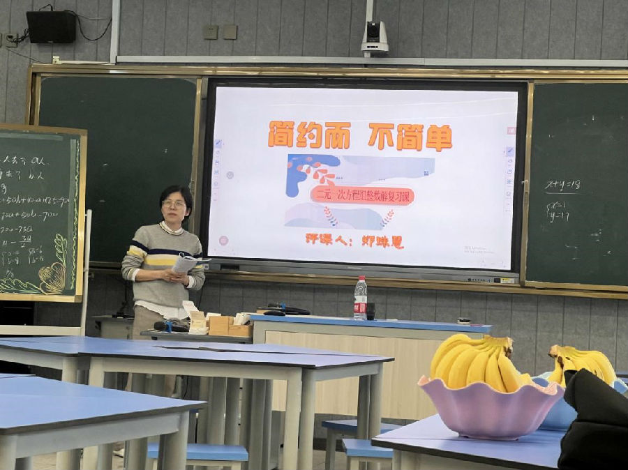 第三位评课的老师是来自苍南县宜山镇第一中学的郑珠慧老师,郑老师就《二元一次方程单元复习》进行展开,她表示本节复习课简约而不简单。课堂由实际问题到知识回顾,方程组整数解、整体思想,再到实际应用以一题贯之,用简约的问题情境,给课堂教学“瘦身”,为学生思考“留白”整个环节看似简约,但课堂的生成和反馈却很不简单,不仅能调动学生的积极性和参与度,也能引发学生进入深层的思索,一题多解促进学生发散性思维的形成,推动学生向高阶学习迈进,拓宽了思维的广度。