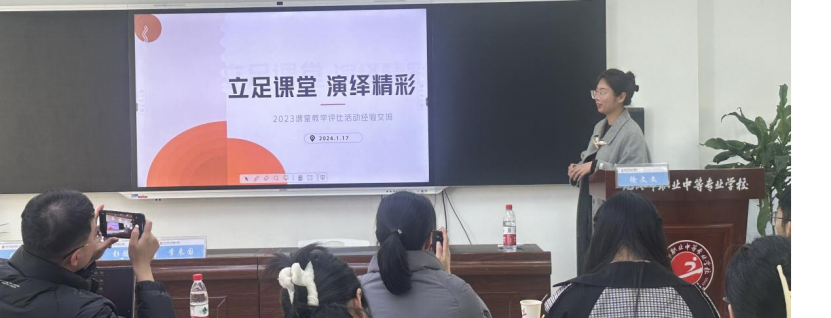 瑞安市职业中等专业教育集团学校彭朋思老师带来了成果展示《细化于微 量化于效——2023年温州市课堂教学评比一等奖经验分享》。彭朋思老师从“文件解读、构思心路、成果展示、成长与反思”四个方面分享了参赛经验,使大家真切感受到“细化于微 量化于效”的深刻含义。在收集资料时,收集教学设计、论文与数学杂志等资料,博观约取;在构思教学时,以生为本,数专融合,采取可视化教学与支架教学;在撰写教学设计时,注重措辞与文本可视化呈现样式,凸显设计亮点;在积极备赛时,善于借助团队力量,不断优化。