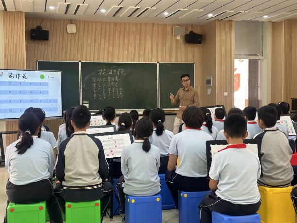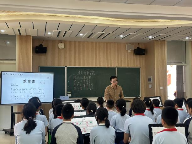 上午第一节课由温州大学城附属学校章超老师和五(5)班同学共同完成歌唱课《花非花》,章超老师从学生朗诵的韵律入手,鼓励学生自主探索古诗词朗诵的长短韵味,再到挥洒笔墨,结合音乐的旋律、长短、强弱等基本要素,展现有深度地展示了对歌曲《花非花》的对作品的处理和理解,为学生营造了虚无缥缈的诗词意境,铺设了浓厚的古风色彩。最后独具匠心地采用“依曲填词”的方式用几首不同古诗词填入花非花的旋律,进一步内化歌曲的旋律,完成了一节心意满满的创意音乐课。