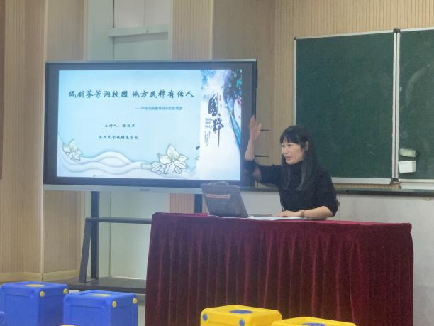 随后是温州大学城附属学校徐丽燕老师带来的《瓯剧芬芳润校园 地方民粹有传人》专题讲座。徐老师通过丰富的素材和案例,讲述了她学校瓯剧文化从无到有的经历,由“向阳花”社团到戏曲进课堂,到进年段、跨学科教学,再到辐射远在国外的同龄人,徐老师用自己的扎扎实实一步一脚印的实例,展示了大学城学校传承民族传统文化的博大情怀和独有的“匠人”精神。