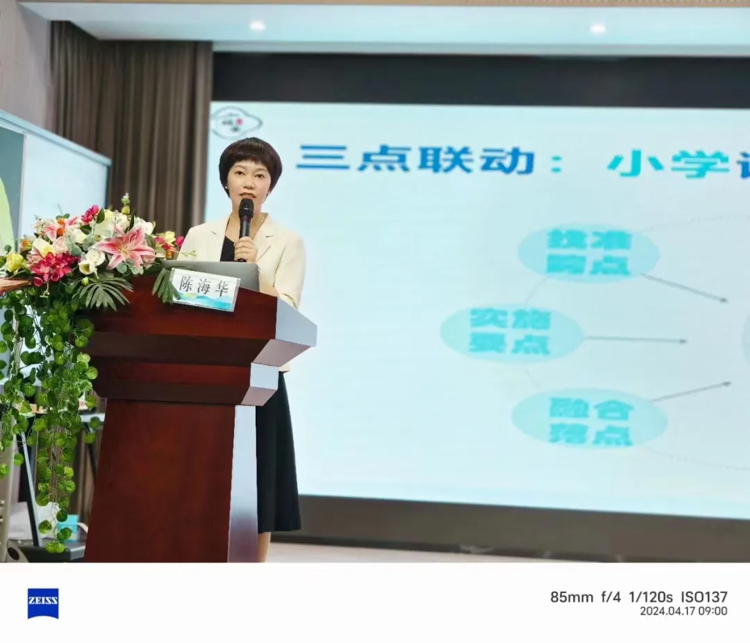 活动伊始,工作室主持人、市实验小学教科室主任陈海华老师带来了以《三点联动:小学语文跨学科学习的设计与实施》为题的主旨报告。陈老师以“1+3”项目化学习实施的实小样态为例,提出在实践跨学科学习时教师需要找准“跨点”,提炼学习主题;实施“要点”,项目驱动,展开学习活动;确定好“落点”后,将其与之融合,将评价可视化、专业化以及全程化。