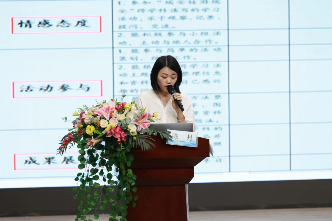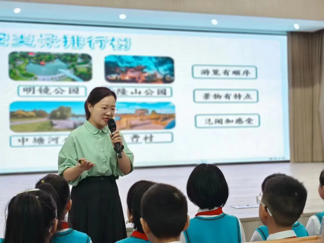 在市实验小学金霞飞老师的主题收获课上,她引导学生展示跨学科学习成果,通过朗诵、吟唱、造型、绘本展示介绍等各种形式的汇报,展示学生的特长,融合语文、美术、音乐、信息技术等各学科,发展学生的素养。最后金老师引导学生通过自评、组评、师评,选出“最佳美景推介官”。学生在真实语言运用情境中,提高语言运用能力,提升思维品质,热爱家乡美景,提升文化自信。