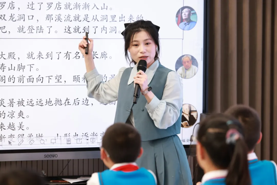 紧接着,市实验小学陈丹老师为我们带来关于四年级下册第五单元的整体架构。结合瑞安文旅发布了2024年寻找最佳推介官的活动,以读写为路径,设计了以“瑞安娒游瑞安,做美景推介官”为学习情境,将学习内容整合为“赏画卷 ——借助游览路线学课文 ”“绘路线——写过渡明确顺序,学名篇——借助写景方法写特点”“写美景——迁移写景方法写成篇”等三个子任务。教研团队统筹学习主题、学习目标、学习内容、学习评价等多方要素,融合各科学习内容,环环相扣,结合情境,在激发学生学习兴趣的同时,引导学生把握学习的逻辑,提升语文素养。