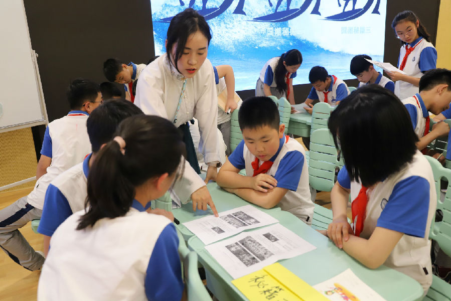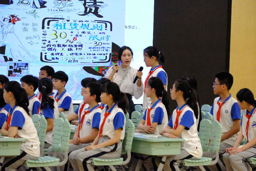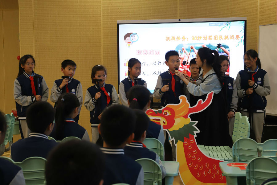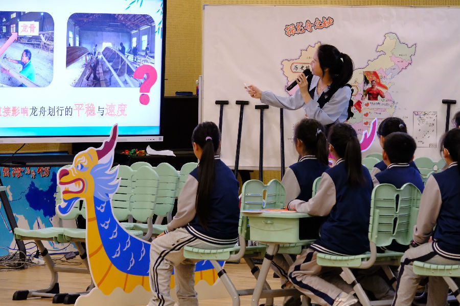首先由温州建设小学周晨瑶老师带来一节名为《探龙舟之秘,扬中华文化》的课例展示。本课借温州承办杭州第19届亚运会龙舟赛事的契机,以“家门口”的龙舟赛导入,带领同学们开启一场龙舟历史、竞渡、工艺的探秘之旅。历史小课堂、团队挑战赛等环节……周老师站在儿童视角,以儿童喜闻乐见的活动形式创设探秘旅程。同学们在有趣且有效的活动体验中,真正感受龙舟背后悠久的历史,深厚的精神、文化,从而增强对龙舟文化的自信,萌发传承意识,自发践行传承活动。