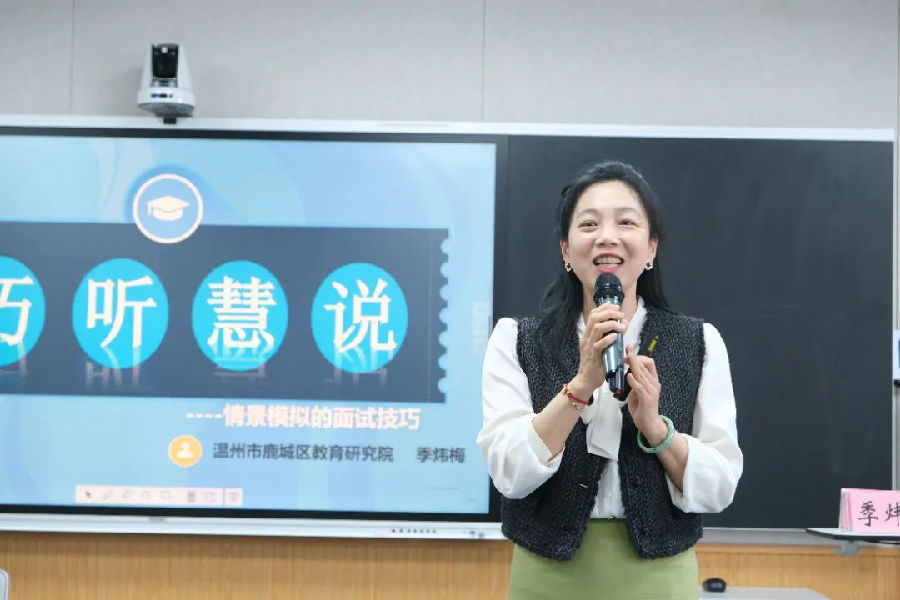 温州市鹿城区教育研究院季炜梅老师,给我们带来讲座《巧听慧说---情景模拟的比赛技巧》。她从情景模拟的内容、评分标准、准备以及相应的案例方面展开。她提出:第一,班主任要对人本进行分析,抓住重点,深入思考。第二,现场呈现,助演互动环节,班主任的语文表达要谨慎,规范。第三,情景模拟一定要解决当下的问题,对策要有可操作性,指导性,真实有效。此外,她还强调:班主任要善于留心细节处理,展现班主任工作的细致与专业。