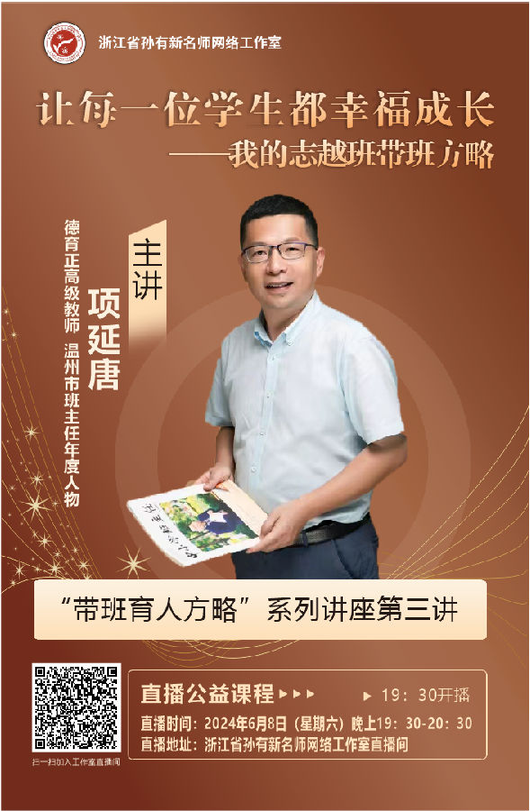 一.主题:带班育人方略分享二.时间:2024年6月8日晚上7点半—8点半三.地点:浙江省孙有新名师网络工作室直播间(扫海报二维码即可观看)四.内容:讲座《让每一位学生都幸福成长——我的志越班带班方略》五.主讲人:项延唐,龙港市实验中学班主任,浙江省孙有新名师网络工作室学科带头人,浙江省德育正高级教师,温州市名班主任。六.具体要求:请大家安排好其他事情,准时参加!每一位学员都要写200字左右的学习心得,截止6月9日晚上9点前提交小程序,请务必高质量准时完成!