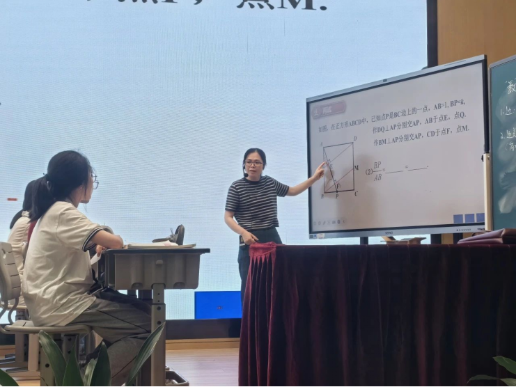 首先,来自温州市第二中学的吴晓飞老师带来《数解正方形》一课。吴老师从正方形入手,通过不断添线,发现边之间的关系可以折射出角的关系,从而也关联着图形之间面积的关系。在吴老师的引导下,学生从数与形两方面剖析了图形之间的关系。整个课堂时刻闪现着思维的火花,引人入胜。