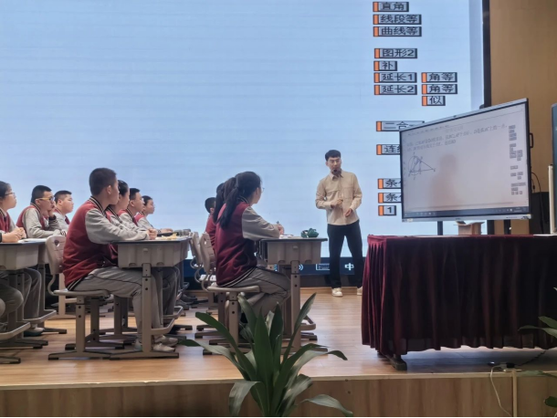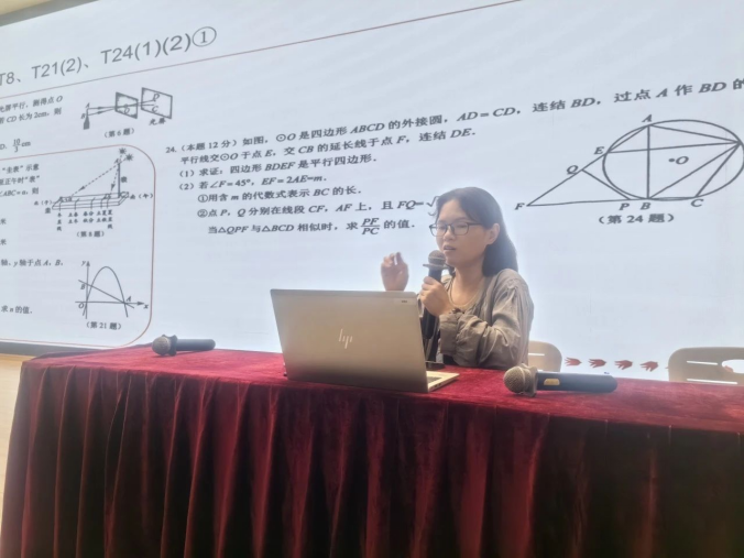 紧接着温州市第二实验中学的金麒老师带来《“圆”来是这样》一课。金老师从圆的老朋友“垂径定理”和“圆内接四边形”入手,以丽水一模第24题为背景,带领学生挖掘复杂图形背后的基本图形。金老师通过一题多解,让数学知识在学生的思维中实现联动,让数学课堂变得生动有趣。