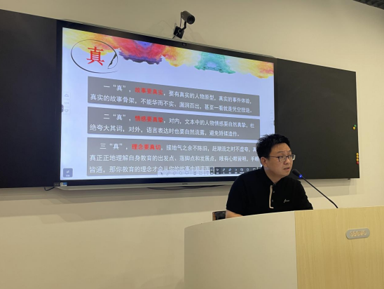 下午,周建华、邱吕央、郑嘉伟三位老师轮流上台,分享了他们在论文撰写、教育叙事和教育故事实践中的心得体会。