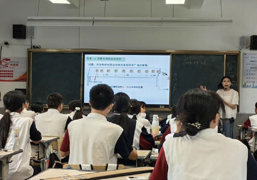 第二节由温州市第八中学林冬冬老师带来《运动和力》单元复习课,她结合任务单,设计了多个任务:根据木块的运动状态,分析各阶段木块受力情况,归纳木块运动和力的关系。完成本节课核心任务——思维导图,再佐以实验来验证相关内容。整个课堂任务设计层层递进,充分发挥学生的主体能动性,不断激发学生深度学习。