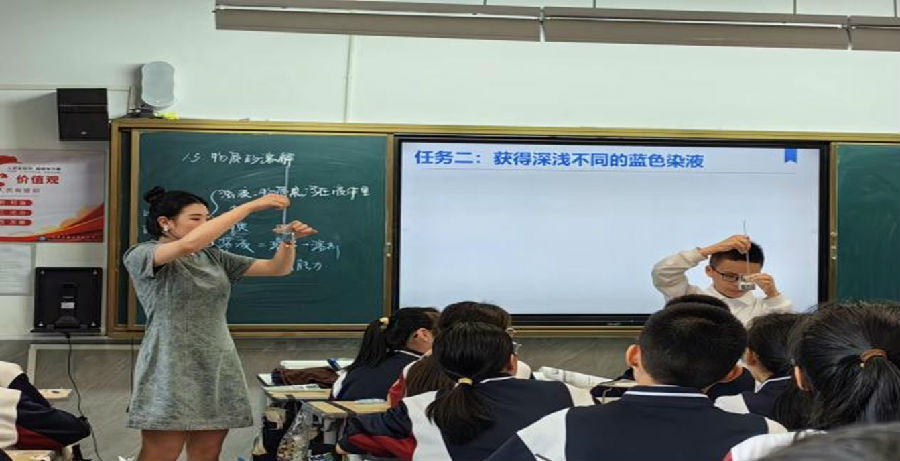 第三节为由温州市双屿实验中学沈伊冉老师带来的《物质的溶解》,本课的主线任务是以小组为单位,“探秘”蓝染工艺。在实验与观察的过程中,学生领悟了溶解的定义与特征,探究了各种因素对物质溶解性的影响,这一项目化活动展现了科学课堂贴近生活、联系实际的特点,学生们的学习成果也呈现得丰富多彩。